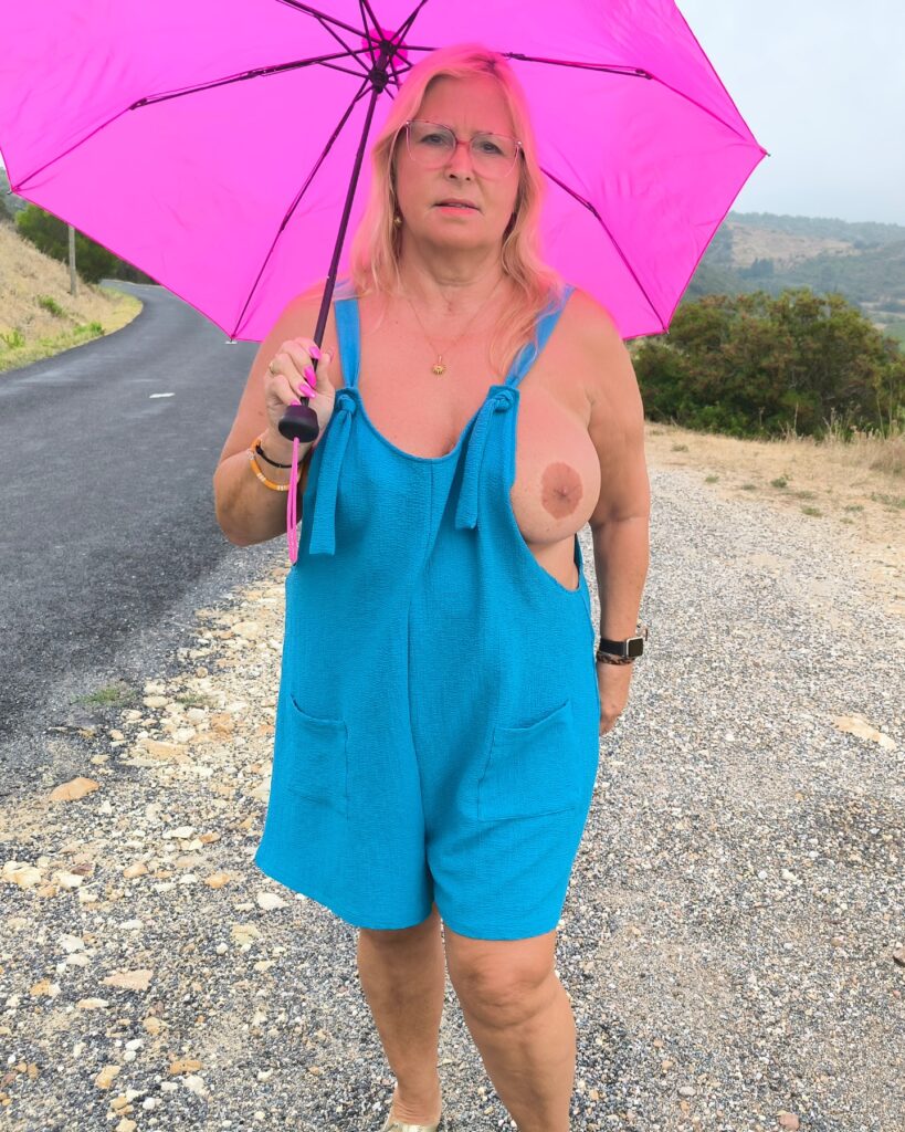The further I drove into the hinterland of the Corbières, the more it began to rain and I had to unpack the umbrella. I then just took a little walk with the umbrella so you could see my bouncing breasts.
