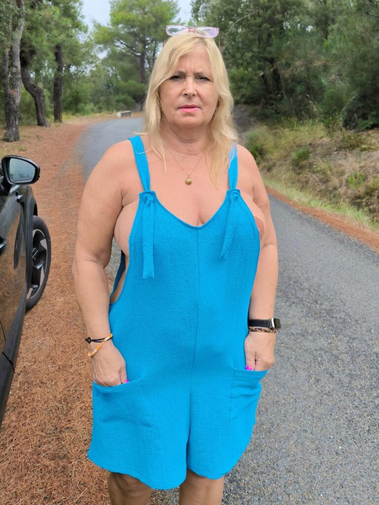 By the time it is boring to just lie on the beach. On the other hand, it’s hard for me to put on any clothes if you’re always naked in the naturist facility. So you just throw something light on yourself. It’s warm enough. I put on a very loose “playsuit” today. That’s only a part and underneath I was completely naked. The part could not completely cover my large breasts. When running, the breasts on the left and right were always visible. With every movement, the big tits wobbled a lot. I made a few videos for you.